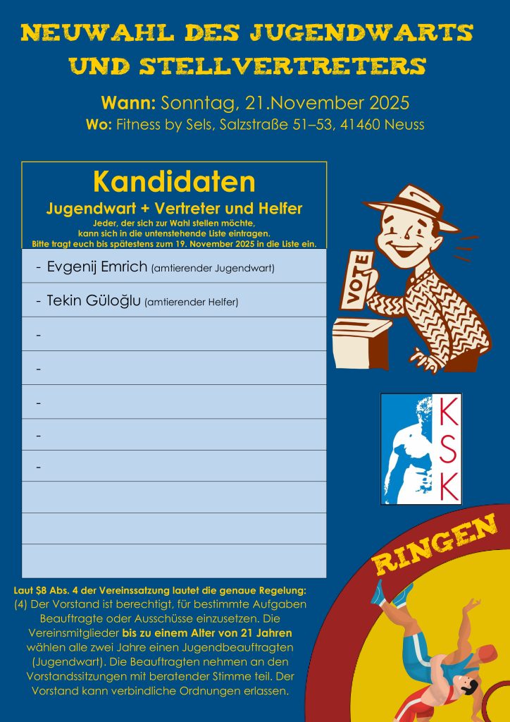 Am Freitag, den 14. November 2025, finden im Rahmen des Vereinsgeschehens die Neuwahlen des Jugendwarts, des stellvertretenden Jugendwarts sowie der Jugendhelfer statt.